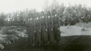 Black and white photographs of the Stockholm novitiate lined up side by side. The women include: Theresia, Moriam, Francesca, Maris, and Philomena. Photograph maintained in the Bishop Farrell Library & Archives: Sisters of Social Service fonds. Original date of creation: [c.1940]